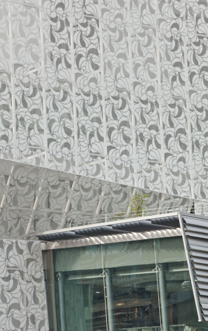 Consideration for the tropical context- sunscreens became a design feature for the southern street-facing facade. Like a fabric sail- a laser-cut aluminium unfurls above the ship’s prow with custom perforation creating a translucent effect. While dramatically reducing the solar gain to the office floors, it allows views from the inside out throughout the day.